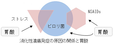 胃・十二指腸潰瘍の主な原因はピロリ菌、NSAIDs(非ステロイド性消炎鎮痛薬)、ストレスの3つといわれていて、その中でもピロリ菌の感染によるものが一番多く、これを除菌することによって改善や再発の防止ができます。