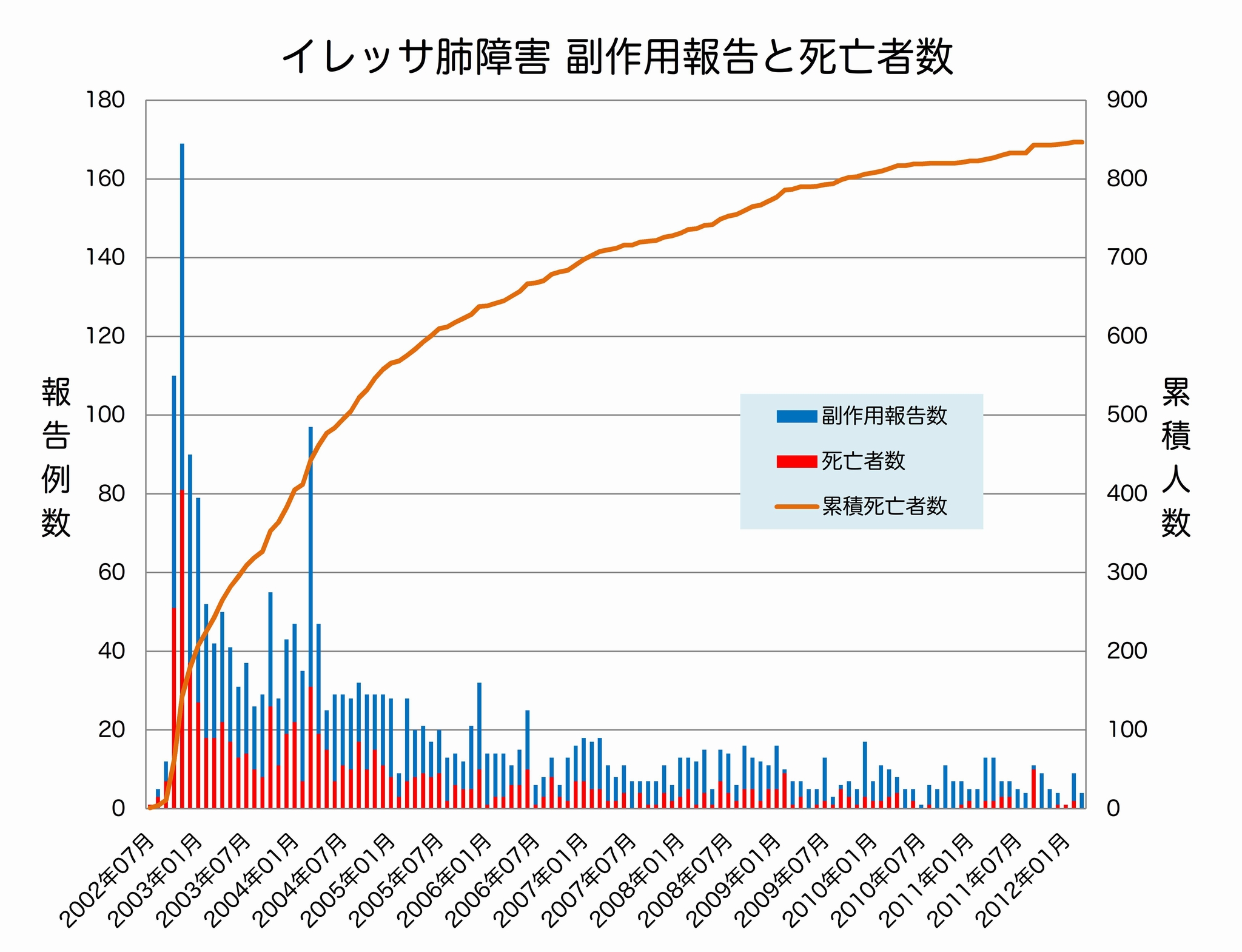 2012年3月末までに厚生労働省へ報告された副作用の数は2305例、そのうち死亡患者は847人。
