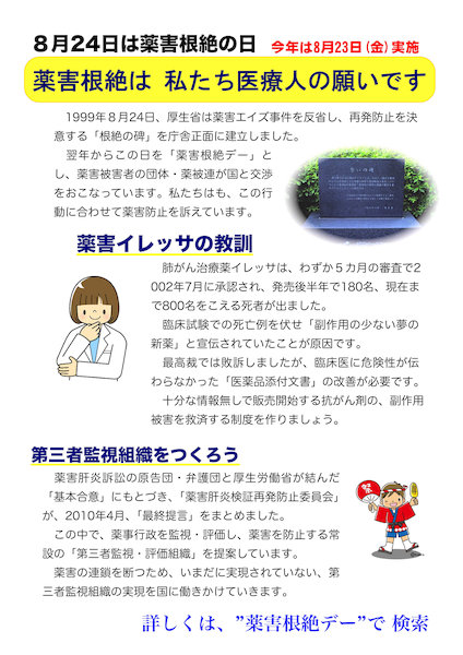 2000年から8月24日を「薬害根絶デー」とし、全国薬害被害者団体連絡協議会(薬被連)が行動しています。